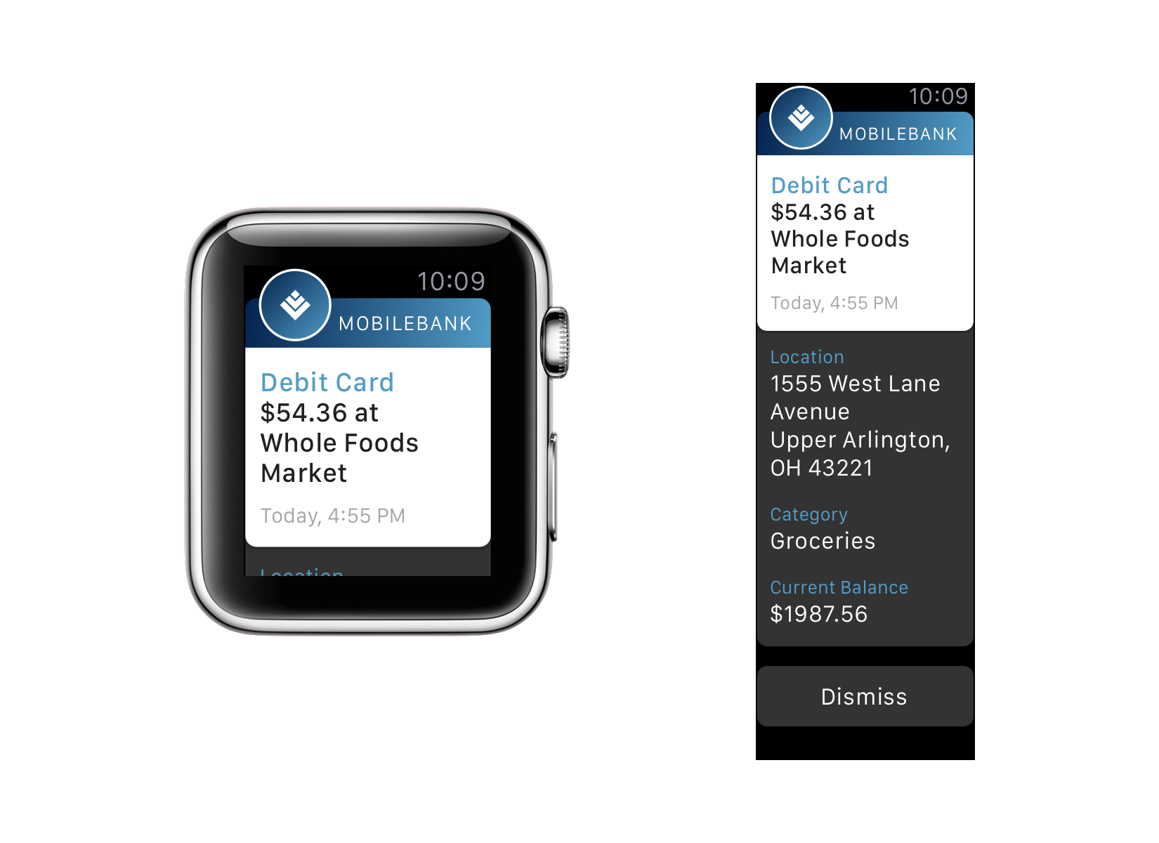 After reviewing WatchKit to understand its capabilities, I experimented with a few ideas of how apps could take advantage of the upcoming Apple Watch release. Below is a concept for a mobile banking app.